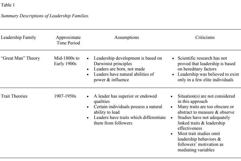 construct demands an examination of the theoretical development of extant leadership theory with particular emphasis given to the transactional-transformational paradigm. Thoughtful academic research on the phenomena of leadership is generally agreed to have emerged toward the end of the 19th Century and early 20th Century (Chemers, 1997; Northouse, 2001; and Stogdill, 1974). Over the past 150 years, five families of leadership theory have emerged, as depicted in Table 1 (Summary Descriptions of Leadership Families). During the initial era of inquiry, Darwinist thinking prevailed, and leadership was thought to be based on heriditary properties (Bass, 1981). Such great man theory approached sequeiaed into an attempt to understand leadership by assessing leader traits. Trait theories, which surfaced in the early part of the 20th Century, prevailed for nearly five decades as preeminent leadership constructs, stipulating that leaders possessed certain characteristics, such as height, intelligence, and self-confidence, which set them apart from followers (Appendix A: Selected Leadership Trait Studies). By the 1950's, however, the field of psychology began to influence the frameworks in which researchers viewed leadership. Behaviorists suggested that leadership could more accurately be understood in behavioral terms, promoting the notion that establishing meaningful relationships with followers and creating task accomplishment structures were critical aspects from which to understand the nature of leadership (Appendix B: Selected Leadership Behavioral Studies). These behavior theories did not, however, adequately address situational variables and group processes (Yukl, 1994). A response to this shortcoming came in the advancement of situational-contingency theories in the 1960s, which proffered that leaders should adapt their approaches or actions pursuant to the context or situation. That is, accoridng to situational-contingency scholars, the situation dictates who emerges the leader or "the product of the situation" (Bass, 1990, p. 285). Situational-contingency theories, like trait and behavior theories, are primarily leader oriented where followers are considered the beneficiaries of leader influence.