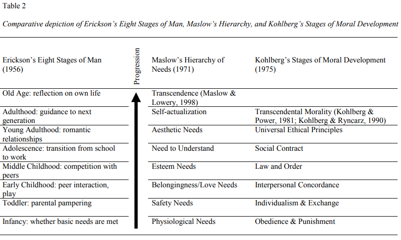 Comparative depiction of Erickson's Eight Stages of Man, Maslow's Hierarchy, and Kohlberg's Stages of Moral Development